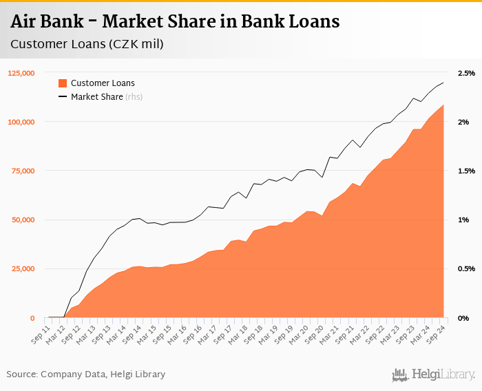 Air Bank's customer loans reached CZK 108,400 mil in 2024-09-30, up 3.24% compared to the previous year.