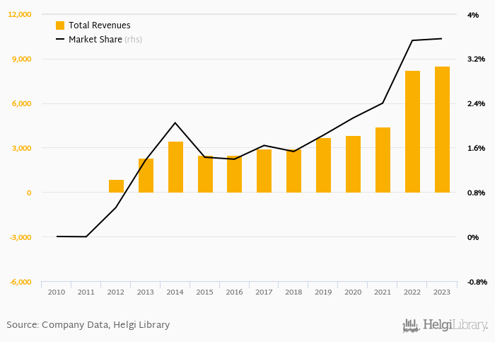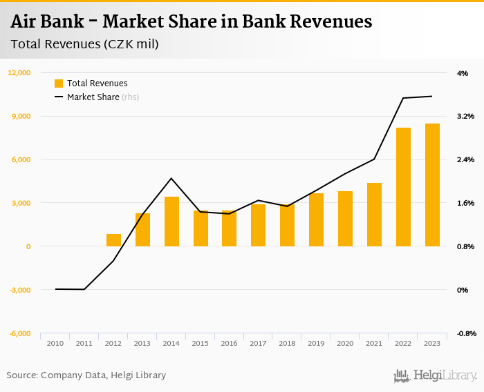As a result, Air Bank accounted for 3.56% of all bank revenues generated by banks in Czechia in 2023. Historically, the bank’s market share in total revenues reached an all time high of 3.56% in 2023 and an all time low of -0.002% in 2011.