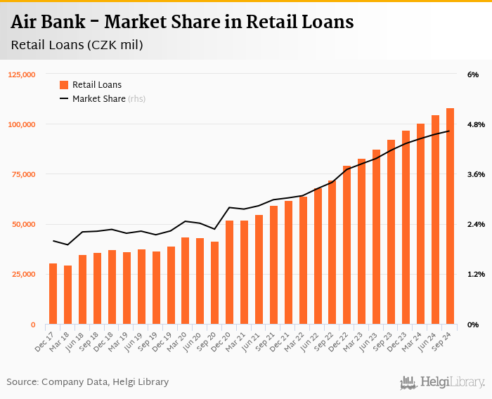 Air Bank's retail loans reached CZK 108,000 mil in the third quarter of 2024, up 3.35% compared to the previous year.