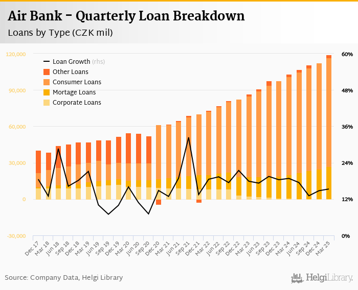 Mortgage loans represented 22.2% of the bank's loan book at the end of the year 1Q2025, consumer further 75.5% and corporate loans 0.210% of total loans.