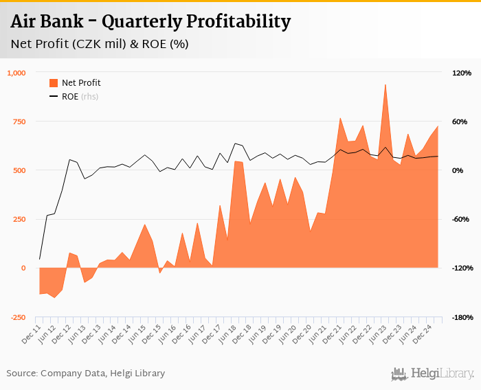 Air Bank made a net profit of CZK 724 mil in the first quarter of 2025, up 5.94% when compared to the same period of last year. This implies a return on equity of 16.6%.