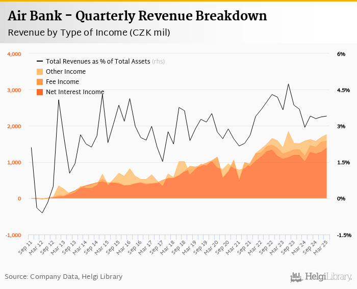 Air Bank generated total banking revenues of CZK 1,762 mil in the first quarter of 2025, up 11.2% when compared to the same period of last year and 4.64% when compared to the previous quarter.