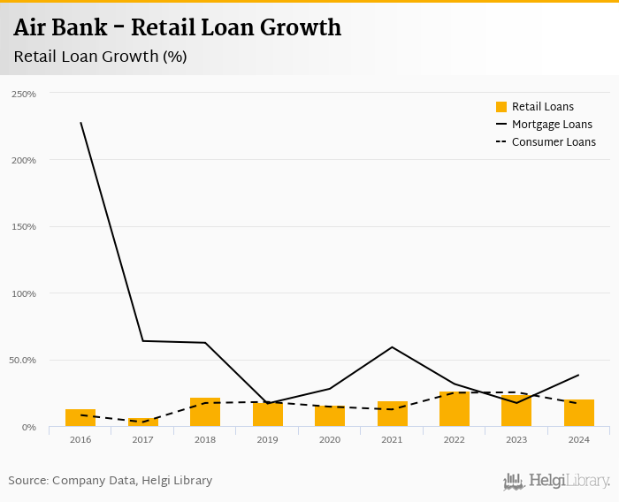 Mortgage loans rose 38.4% to CZK 24,908 mil in 2024 and accounted for 21.4% of the retail loan portfolio.