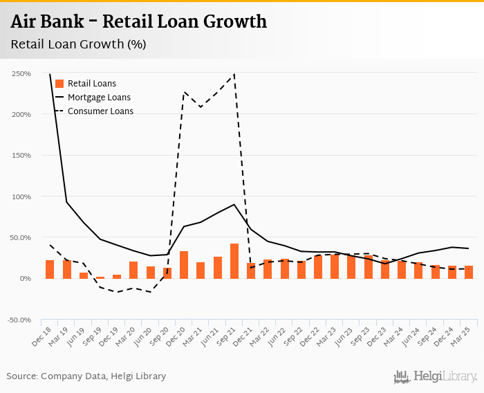 Air Bank's retail loans reached CZK 116,500 mil at the end of 2025-03-31, up 3.90% compared to the previous year. In the last decade, the average annual loan growth amounted to 0%.