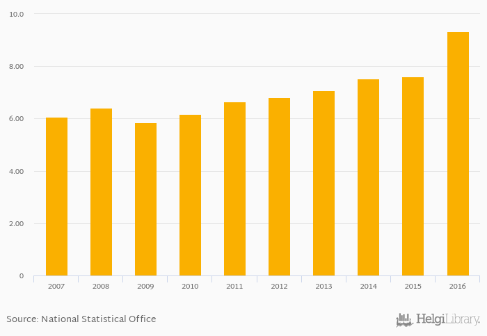 Air transport measured by passengers carried by all carriers rose 22.5% to 9.32 mil in Bulgaria in 2016, according to the National Statistical Office.