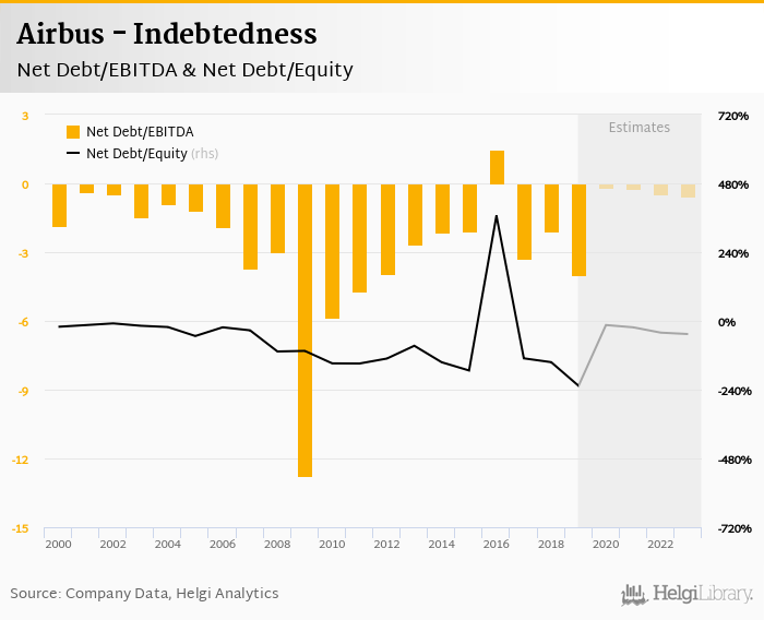 Airbus's net debt stood at EUR -13,572 mil and accounted for -227% of equity at the end of 2019. The ratio is down 82.6 pp compared to the previous year.