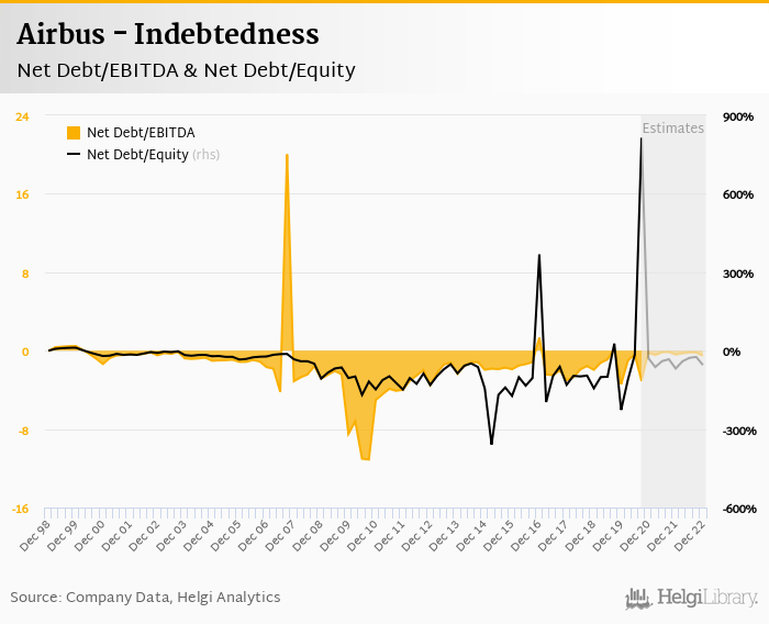 Airbus's net debt stood at EUR 4,586 mil and accounted for 813% of equity at the end of 3Q2020. The ratio is up 786 pp compared to the previous year.