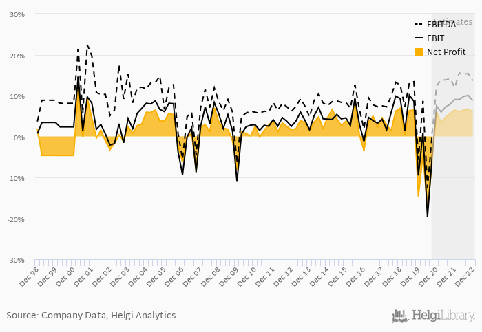 This translates into a net margin of -6.84%. Historically, between 1998-12-31 and 3Q2020, the firm’s net margin reached a high of 11.8% in 1Q2001 and a low of -17.3% in 2Q2020. The average net margin in the last five years amounted to 0.740%.