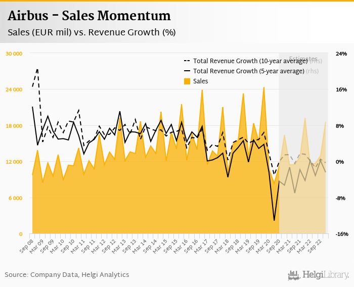 Airbus generated sales of EUR 11,213 mil in 3Q2020, down 26.7% compared to the previous year. Historically, between 3Q1998 and 3Q2020, the company’s sales reached a high of EUR 24,310 mil in 4Q2019 and a low of EUR 2,101 mil in 4Q1998.