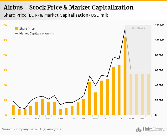 Airbus stock traded at EUR 130 per share at the end 2019 implying a market capitalization of USD 114,621 mil.