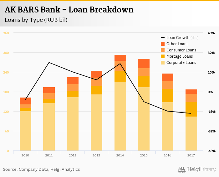 AK BARS Bank's loans reached RUB 188 bil in the 2017, down from RUB 236 bil compared to the previous year. Historically, the bank’s loans reached an all time high of RUB 294 bil in 2014 and an all time low of RUB 162 bil in 2010.