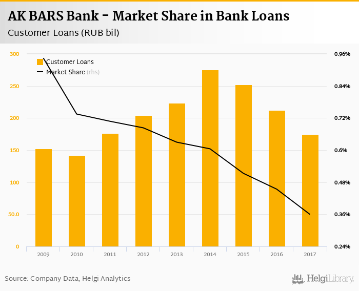 AK BARS Bank accounted for 0.360% of all customer loans issued in Russia at the end of 2017. Historically, the bank’s market share in customer loans reached an all time high of 0.944% in 2009 and an all time low of 0.360% in 2017.