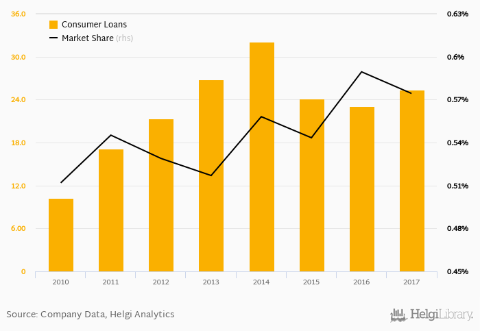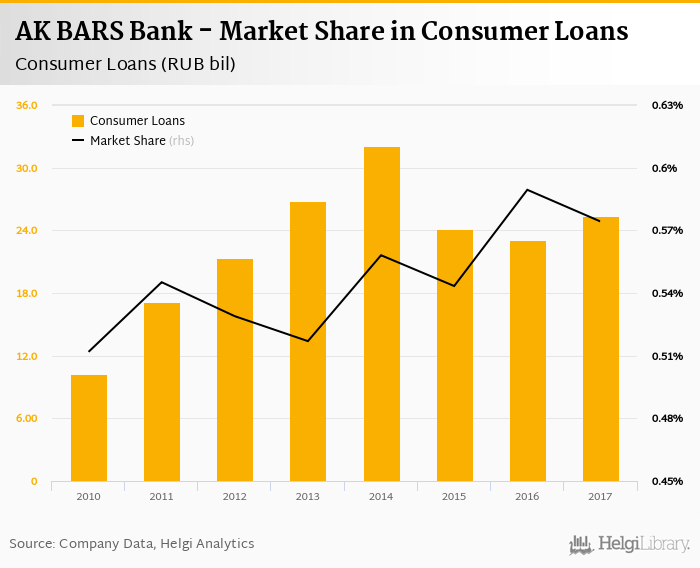 AK BARS Bank accounted for 0.574% of all consumer loans issued in Russia at the end of 2017. Historically, the bank’s market share in consumer loans reached an all time high of 0.589% in 2016 and an all time low of 0.512% in 2010.