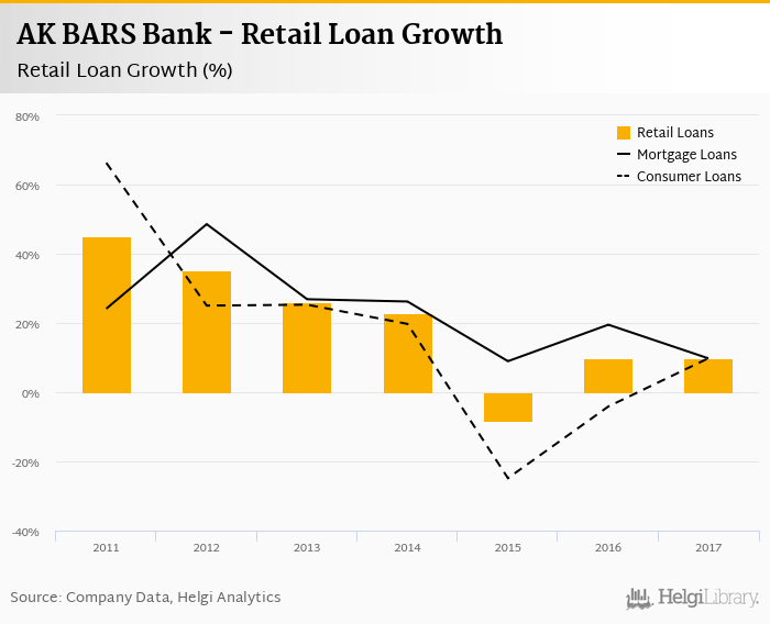 AK BARS Bank's retail loans reached RUB 69.9 bil at the end of 2017, up 9.78% compared to the previous year. In the last decade, the average annual loan growth amounted to 0%.