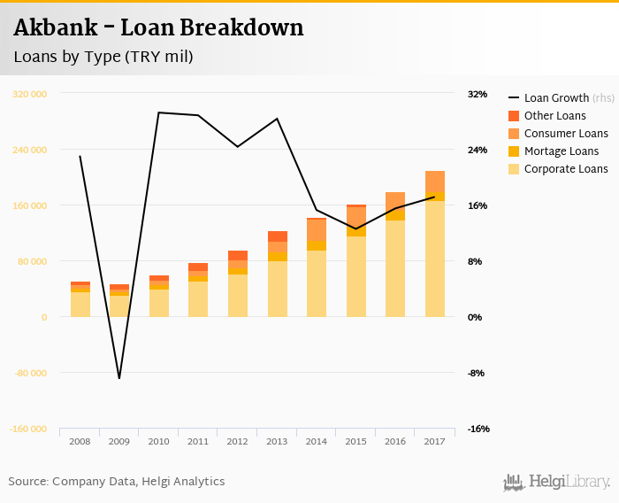 At the end of 2017, Akbank's loans accounted for 104% of total deposits and 61.3% of total assets.