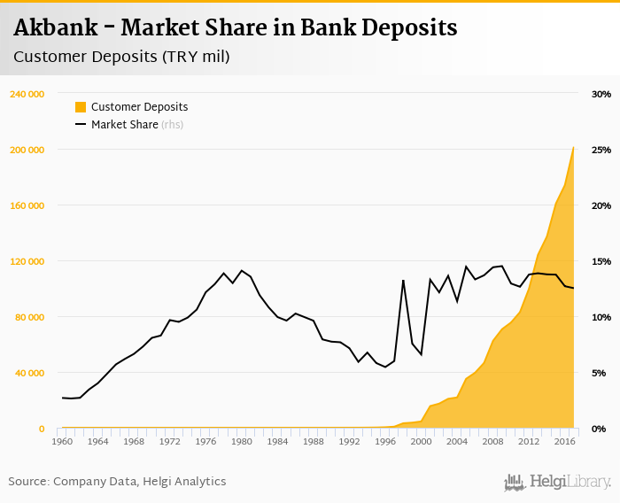 Akbank accounted for 12.5% of all customer deposits taken by banks in Turkey at the end of 2017. Historically, the bank’s market share in customer deposits reached an all time high of 14.5% in 2009 and an all time low of 2.62% in 1961.