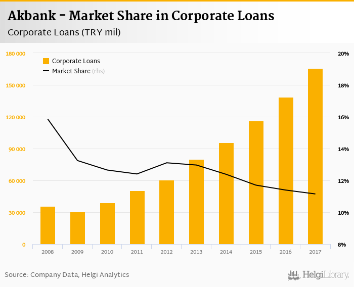 Akbank accounted for 11.1% of all corporate loans issued in Turkey at the end of 2017. Historically, the bank’s market share in corporate loans reached an all time high of 15.9% in 2008 and an all time low of 11.1% in 2017.