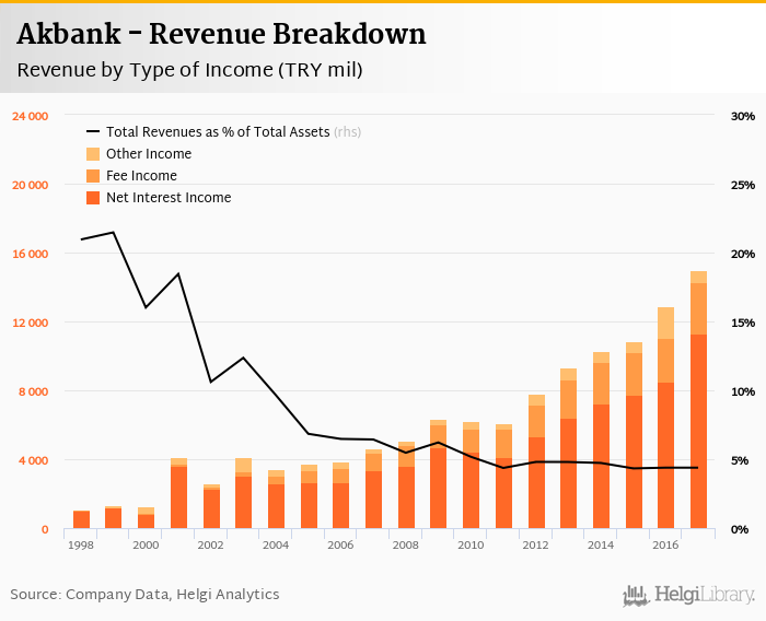 Historically, the bank’s revenues containing of interest, fee and other non-interest income reached an all time high of TRY 14,976 mil in 2017 and an all time low of TRY 1,108 mil in 1998. The average revenue in the last five years amounted to TRY 11,663 mil.