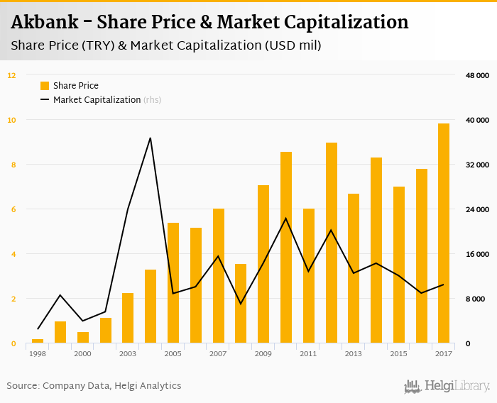 Akbank stock traded at TRY 9.85 per share at the end of 2017 implying a market capitalization of USD 10,416 mil.