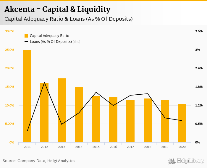 Akcenta's capital adequacy ratio reached 10.4% at the end of 2020, down from 11.4% compared to the previous year. Historically, the bank’s capital ratio hit an all time high of 25.0% in 2011 and an all time low of 10.4% in 2020.