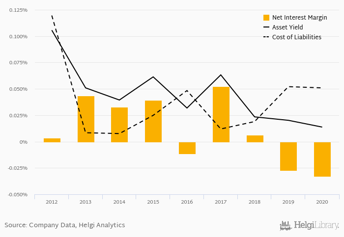 Historically, the bank’s net interest margin reached an all time high of 0.052% in 2017 and an all time low of -0.033% in 2020. The average margin in the last five years amounted to -0.003%.