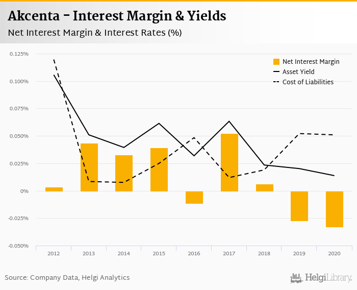 Akcenta's net interest margin amounted to -0.033% in 2020, down from -0.027% compared to the previous year.