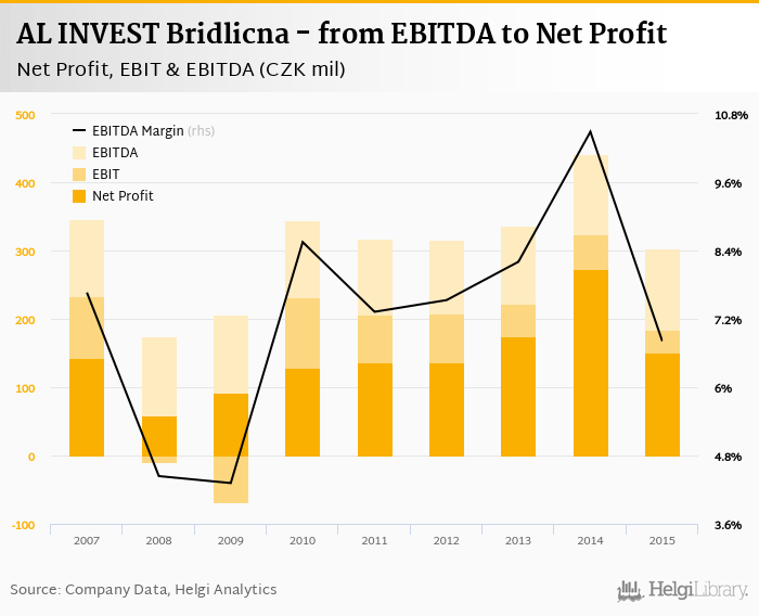 AL INVEST Bridlicna made a net profit of CZK 152 mil with revenues of CZK 4,450 mil in 2015, down by 44.4% and up by 5.74%, respectively, compared to the previous year. This translates into a net margin of 3.41%.