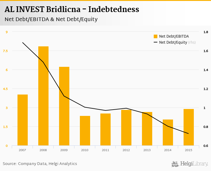 AL INVEST Bridlicna's net debt stood at CZK 878 mil and accounted for 0.724 of equity at the end of 2015. The ratio is down 0.078 pp compared to the previous year.