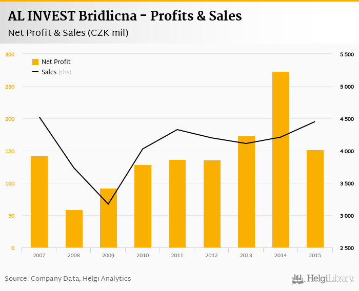 AL INVEST Bridlicna made a net profit of CZK 152 mil in 2015, down 44.4% compared to the previous year. Total sales reached CZK 4,450 mil, which is up 5.74% when compared to the previous year.