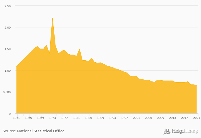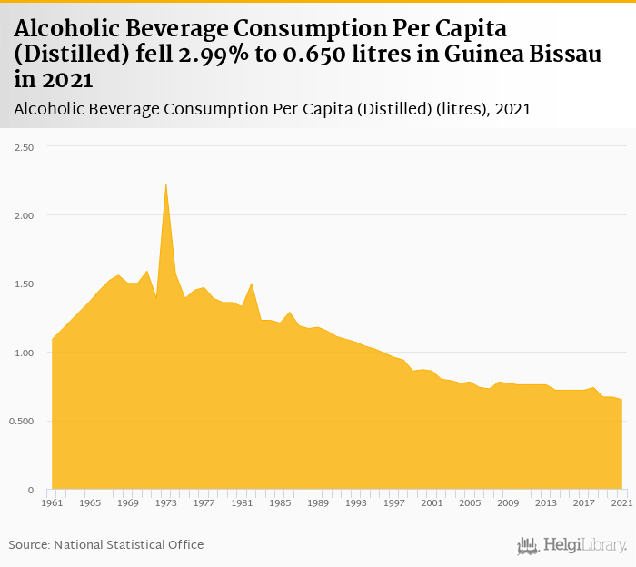 Historically, alcoholic beverage consumption per capita in Guinea Bissau reached an all time high of 2.22 litres in 1973 and an all time low of 0.650 litres in 2021.