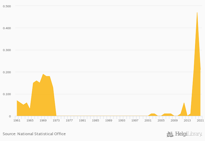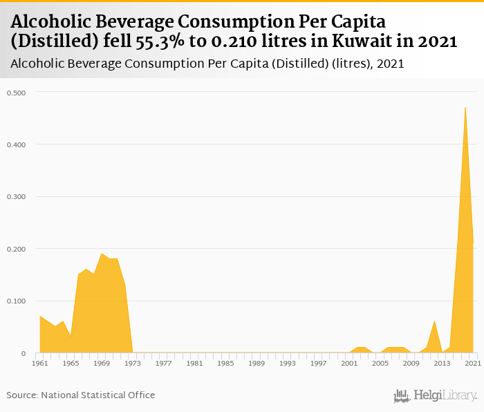 Alcoholic beverage consumption per capita fell 55.3% to 0.210 litres in Kuwait in 2021, according to Faostat.