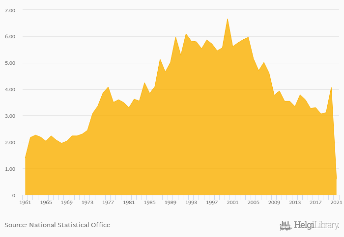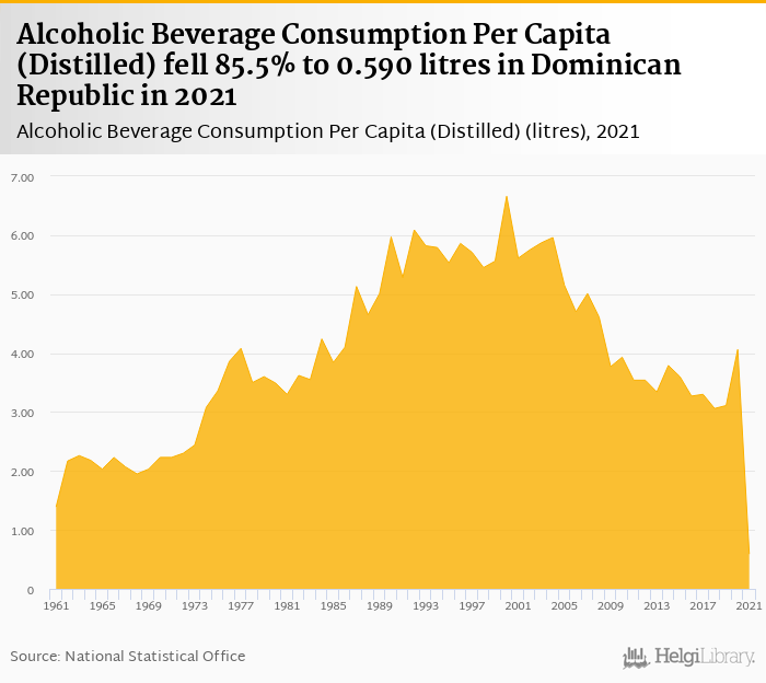 Alcoholic beverage consumption per capita fell 85.5% to 0.590 litres in Dominican Republic in 2021, according to Faostat.