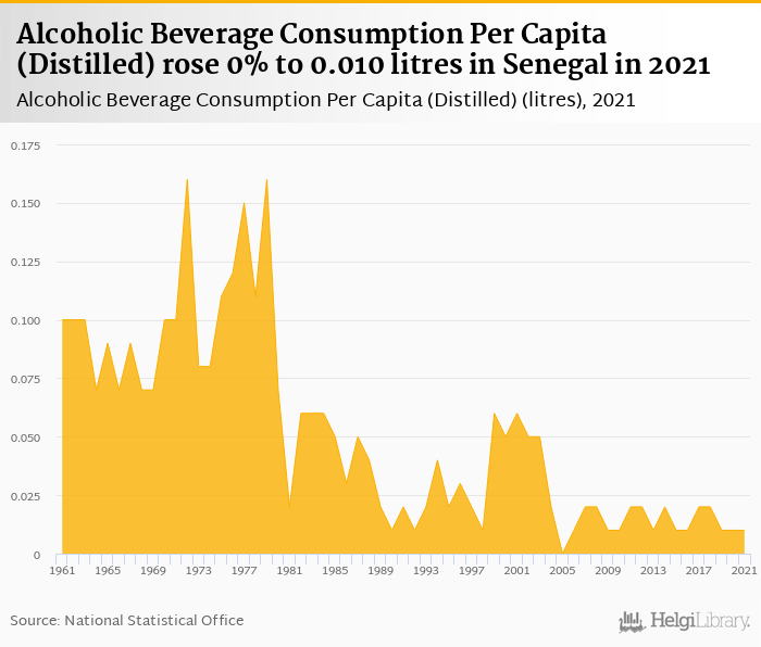 Alcoholic beverage consumption per capita rose 0% to 0.010 litres in Senegal in 2021, according to Faostat.