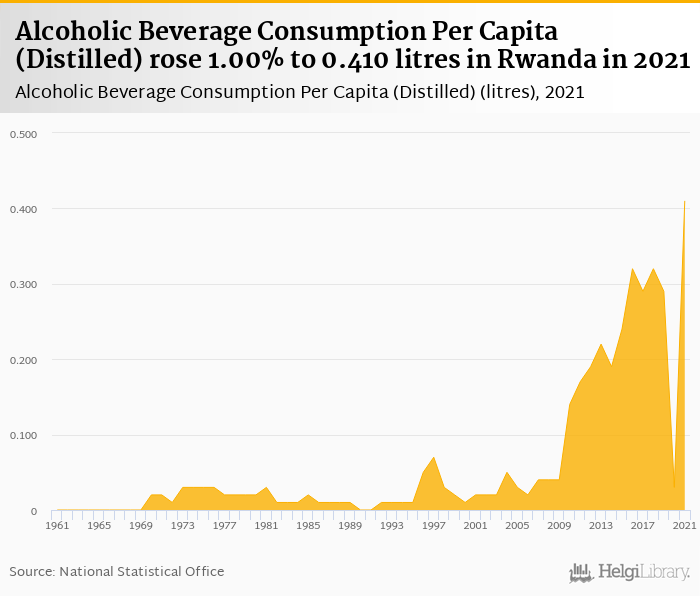 Historically, alcoholic beverage consumption per capita in Rwanda reached an all time high of 0.410 litres in 2021 and an all time low of 0 litres in 1961.