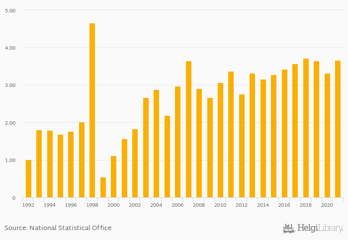 Historically, alcoholic beverage consumption per capita in Croatia reached an all time high of 4.65 litres in 1998 and an all time low of 0.550 litres in 1999. When compared to Croatia's main peers, alcoholic beverage consumption per capita in Bosnia and Herzegovina amounted to 14.2 litres, 2.69 litres in Montenegro, 5.34 litres in Serbia and 2.33 litres in Slovenia in 2021.