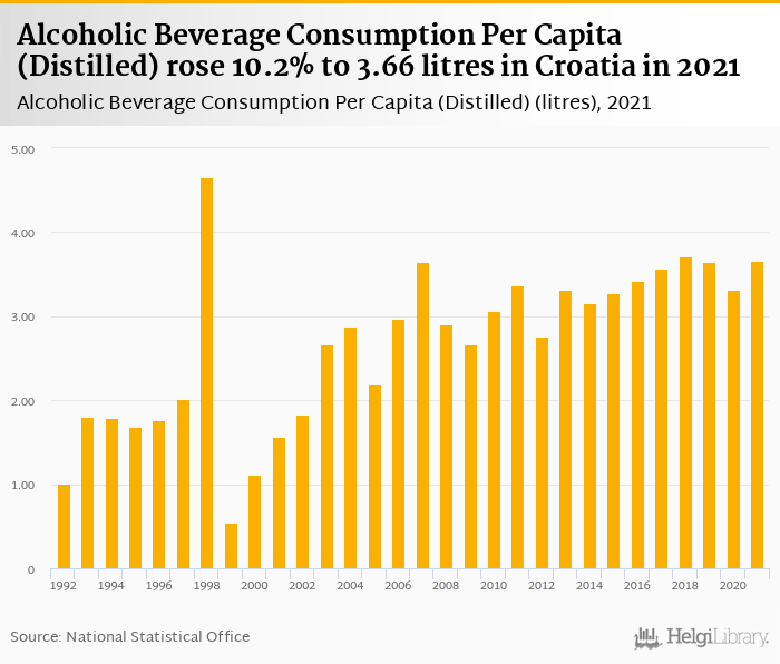 Alcoholic beverage consumption per capita rose 10.2% to 3.66 litres in Croatia in 2021, according to Faostat.