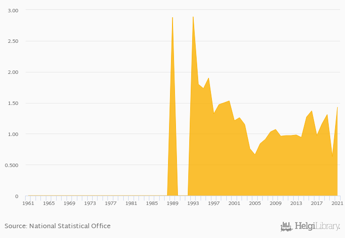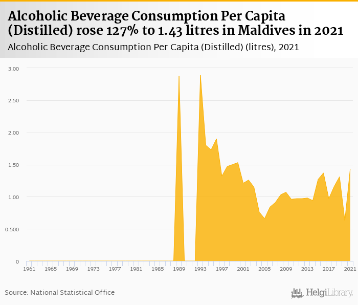 Alcoholic beverage consumption per capita rose 127% to 1.43 litres in Maldives in 2021, according to Faostat.
