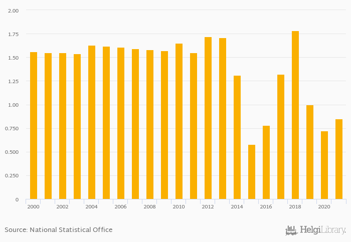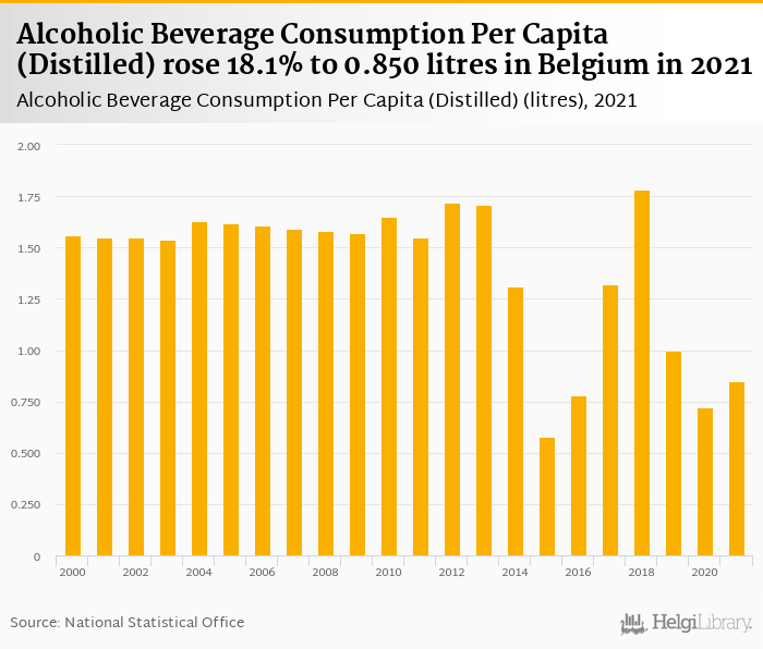 Alcoholic beverage consumption per capita rose 18.1% to 0.850 litres in Belgium in 2021, according to Faostat.
