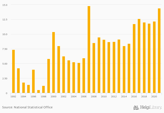 Historically, alcoholic beverage consumption per capita in Azerbaijan reached an all time high of 14.8 litres in 2007 and an all time low of 0.530 litres in 1997.
