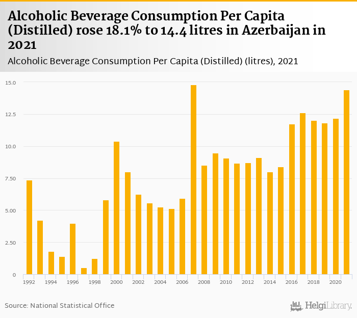 Alcoholic beverage consumption per capita rose 18.1% to 14.4 litres in Azerbaijan in 2021, according to Faostat.