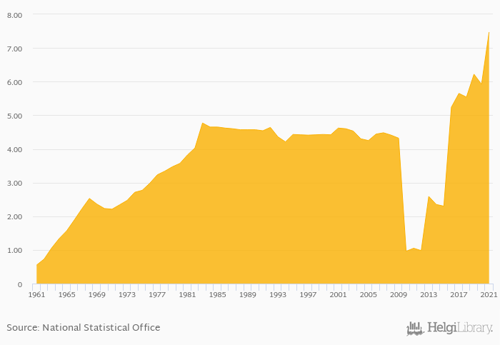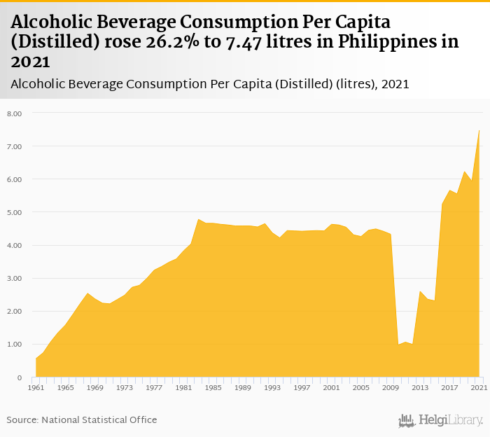 Alcoholic beverage consumption per capita rose 26.2% to 7.47 litres in Philippines in 2021, according to Faostat.