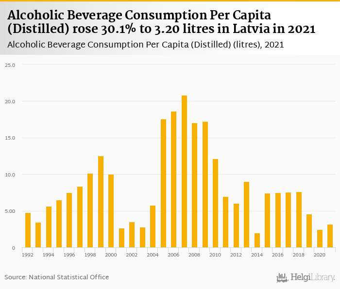 Alcoholic beverage consumption per capita rose 30.1% to 3.20 litres in Latvia in 2021, according to Faostat.