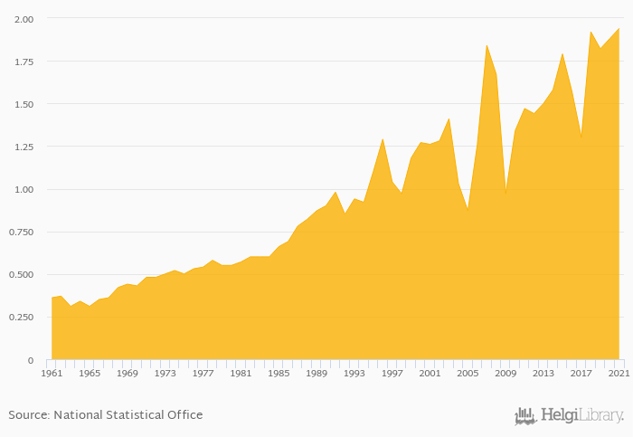 Historically, alcoholic beverage consumption per capita in India reached an all time high of 1.94 litres in 2021 and an all time low of 0.310 litres in 1963.