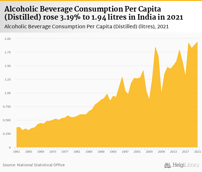 Alcoholic beverage consumption per capita rose 3.19% to 1.94 litres in India in 2021, according to Faostat.