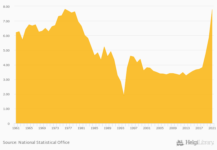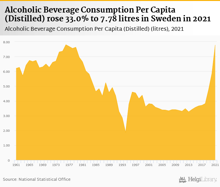 Alcoholic beverage consumption per capita rose 33.0% to 7.78 litres in Sweden in 2021, according to Faostat.