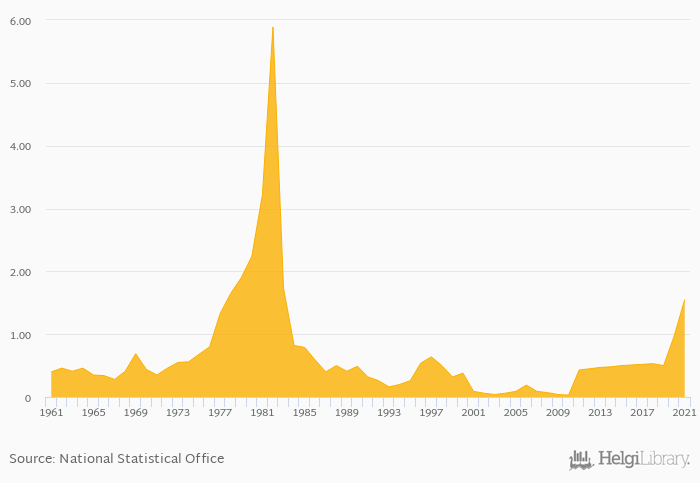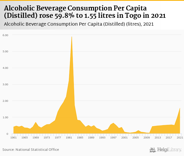 Alcoholic beverage consumption per capita rose 59.8% to 1.55 litres in Togo in 2021, according to Faostat.
