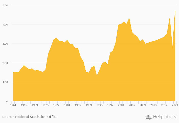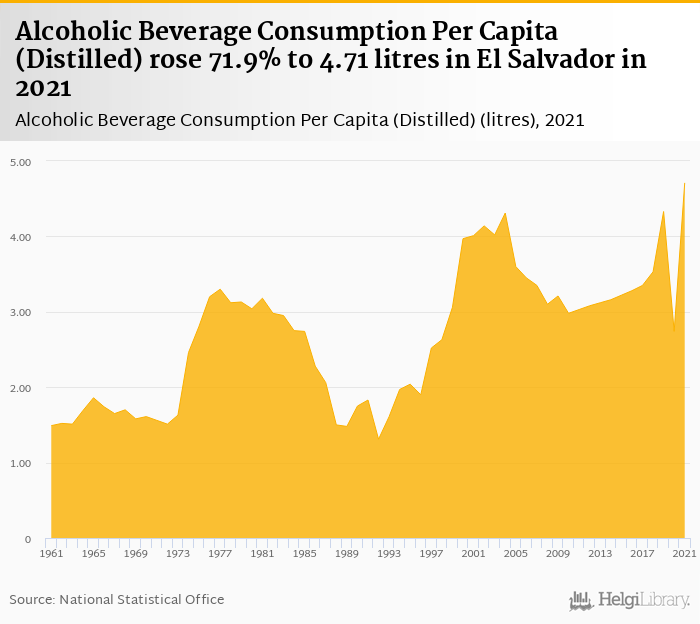 Alcoholic beverage consumption per capita rose 71.9% to 4.71 litres in El Salvador in 2021, according to Faostat.