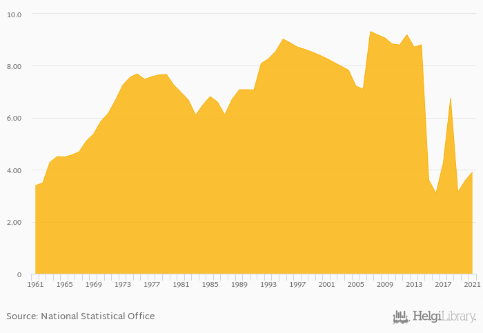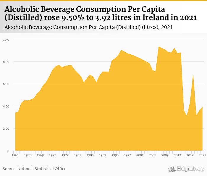 Alcoholic beverage consumption per capita rose 9.50% to 3.92 litres in Ireland in 2021, according to Faostat.