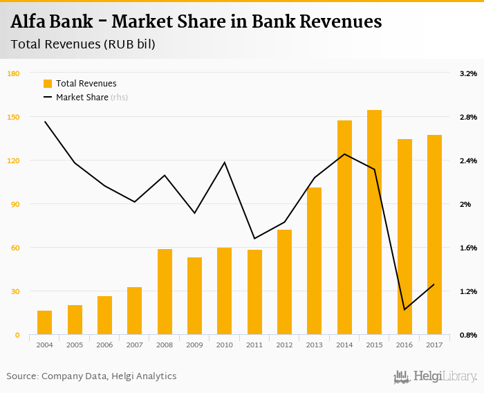 As a result, Alfa Bank accounted for 1.26% of all bank revenues generated by banks in Russia in 2017. Historically, the bank’s market share in total revenues reached an all time high of 2.75% in 2004 and an all time low of 1.03% in 2016.