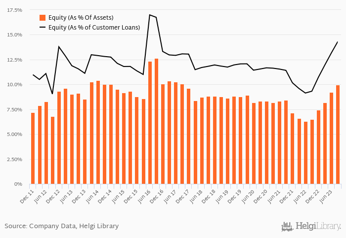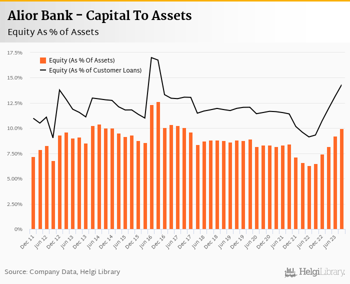 Alior Bank's Equity reached 9.94% of total assets in the 3Q2023, up from 6.48% for the previous year. As a share of net customer loans, the ratio amounted to 14.3% at the end of the third quarter of 2023.